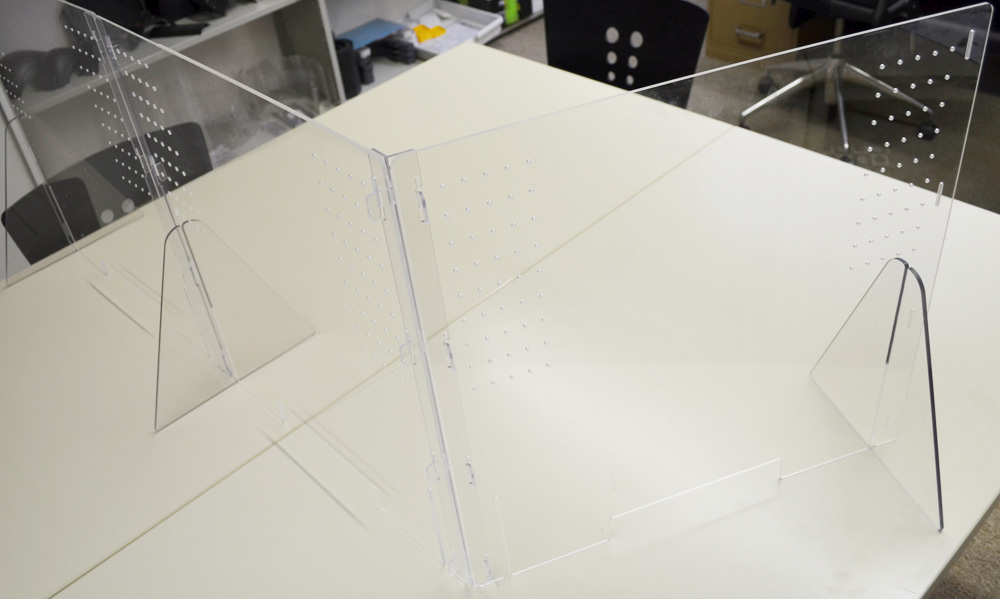 - MODULUS ist ein Spuckschutz, dessen Plexiglas- oder PC-Schutzscheiben von jedem Anwender selber aufgestellt, ausgerichtet und auch wieder abgebaut werden können